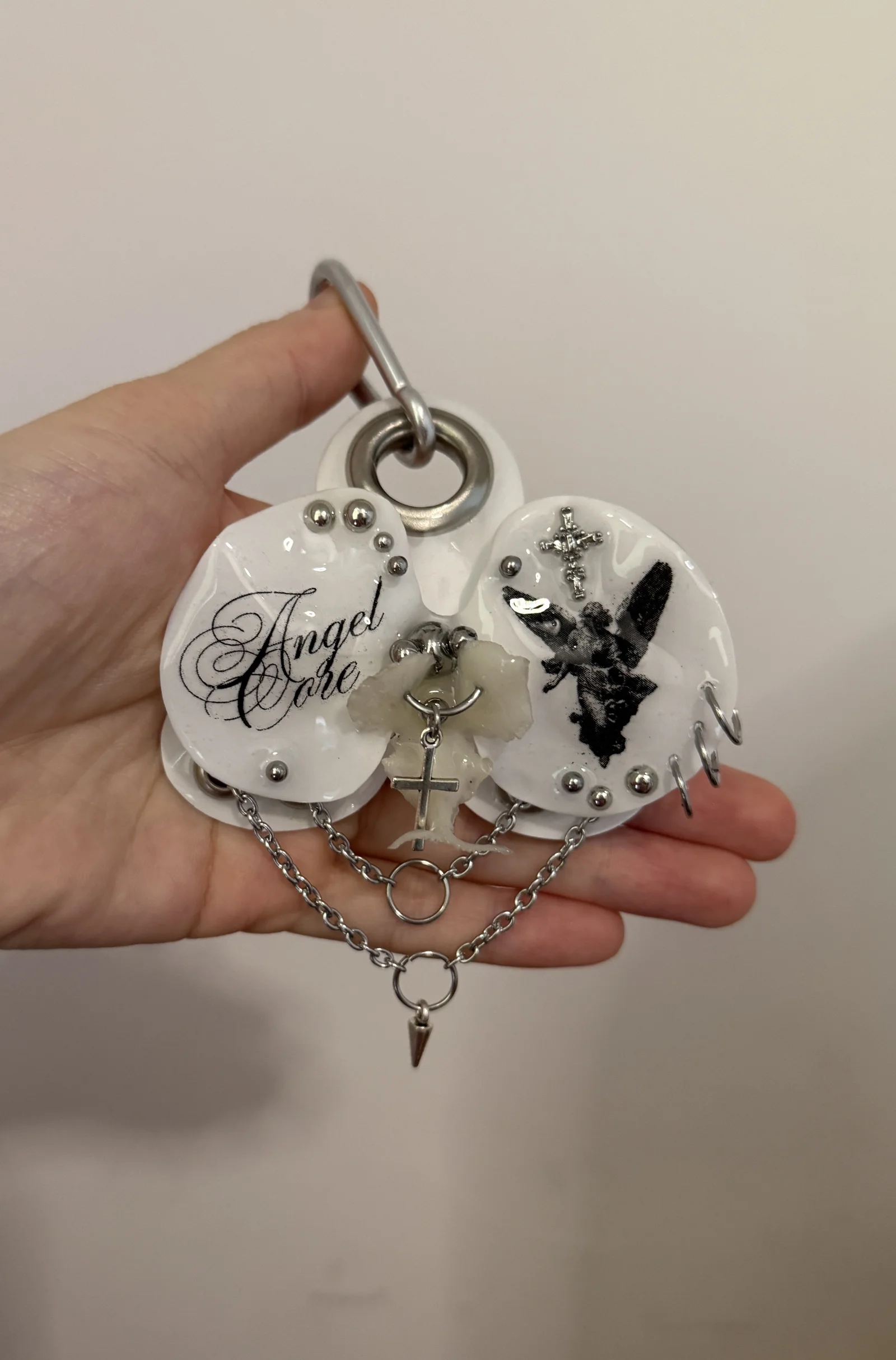 White pierced orchid keychain with silver crosses and chains.