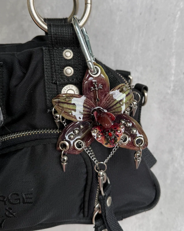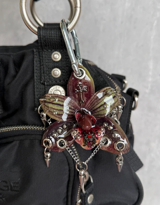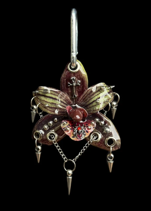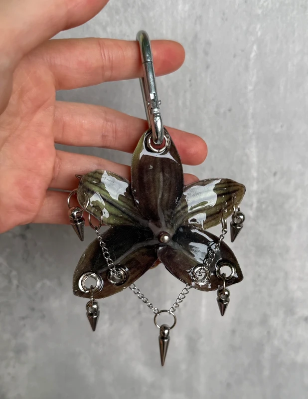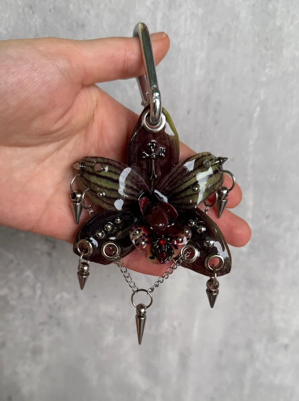 This orchid looks like it grew where the ground keeps its secrets. The petals fade from green to brownish-red stripes, and the center holds a brown stone wrapped in a red, raw-looking ring. It feels like a wound that never fully closes. It can be used as a keychain, a bag charm, or a necklace with your own chain. size: about 10×10 cm artificial flower fully handmade coated with epoxy resin for durability one of a kind, no repeats price is fixed and non-negotiable not fragile, resistant for daily wear