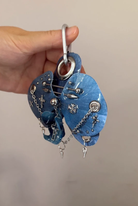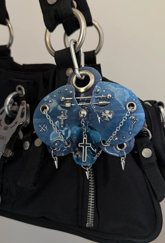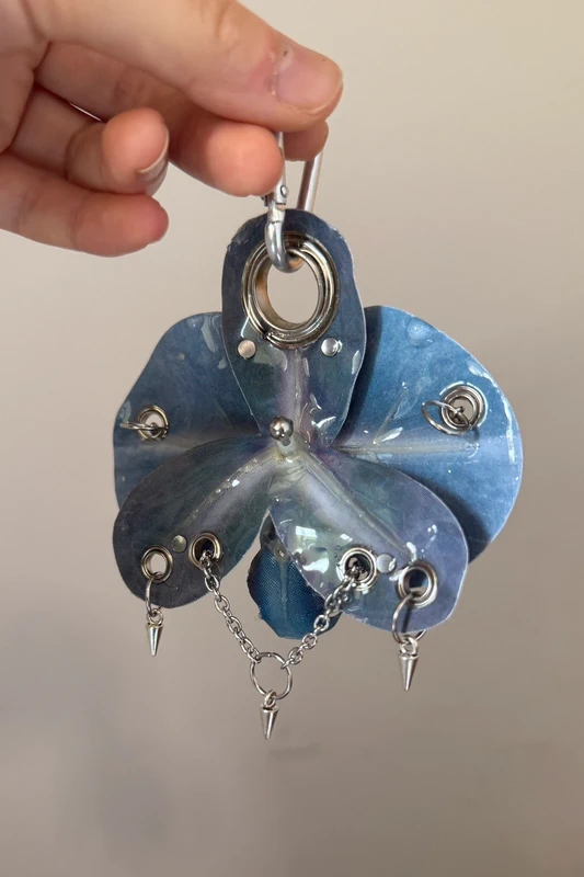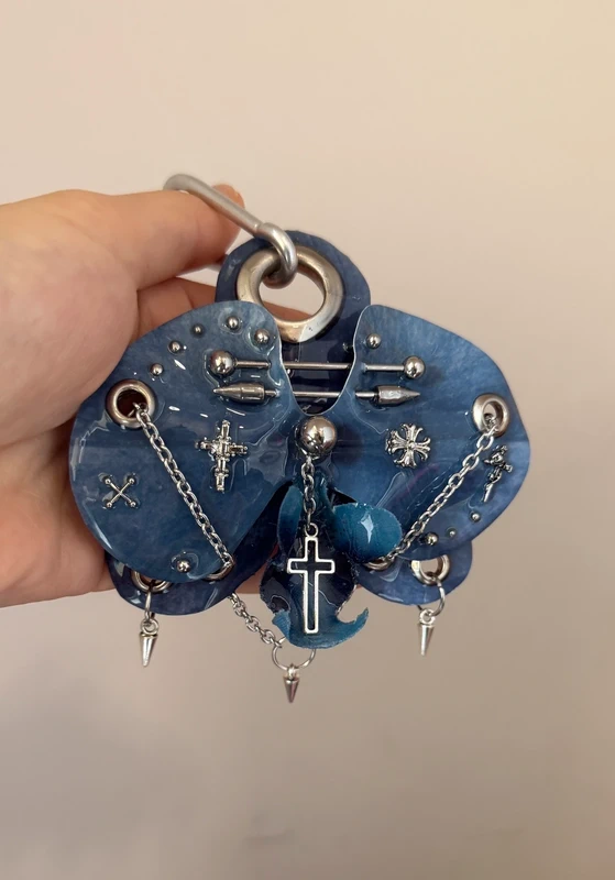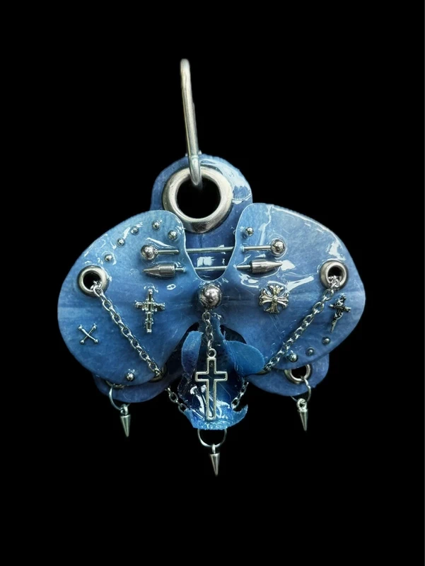 Deep blue pierced orchid keychain with silver crosses, spikes, and chains. Carries a cold, calm energy, like a quiet storm. Soft shimmer meets sacred metal. Feels angelic but untouchable. It can be used as a keychain, a bag charm, or a necklace with your own chain. size: about 10×10 cm artificial flower fully handmade coated with epoxy resin for durability one of a kind, no repeats price is fixed and non-negotiable not fragile, epoxy makes it strong
