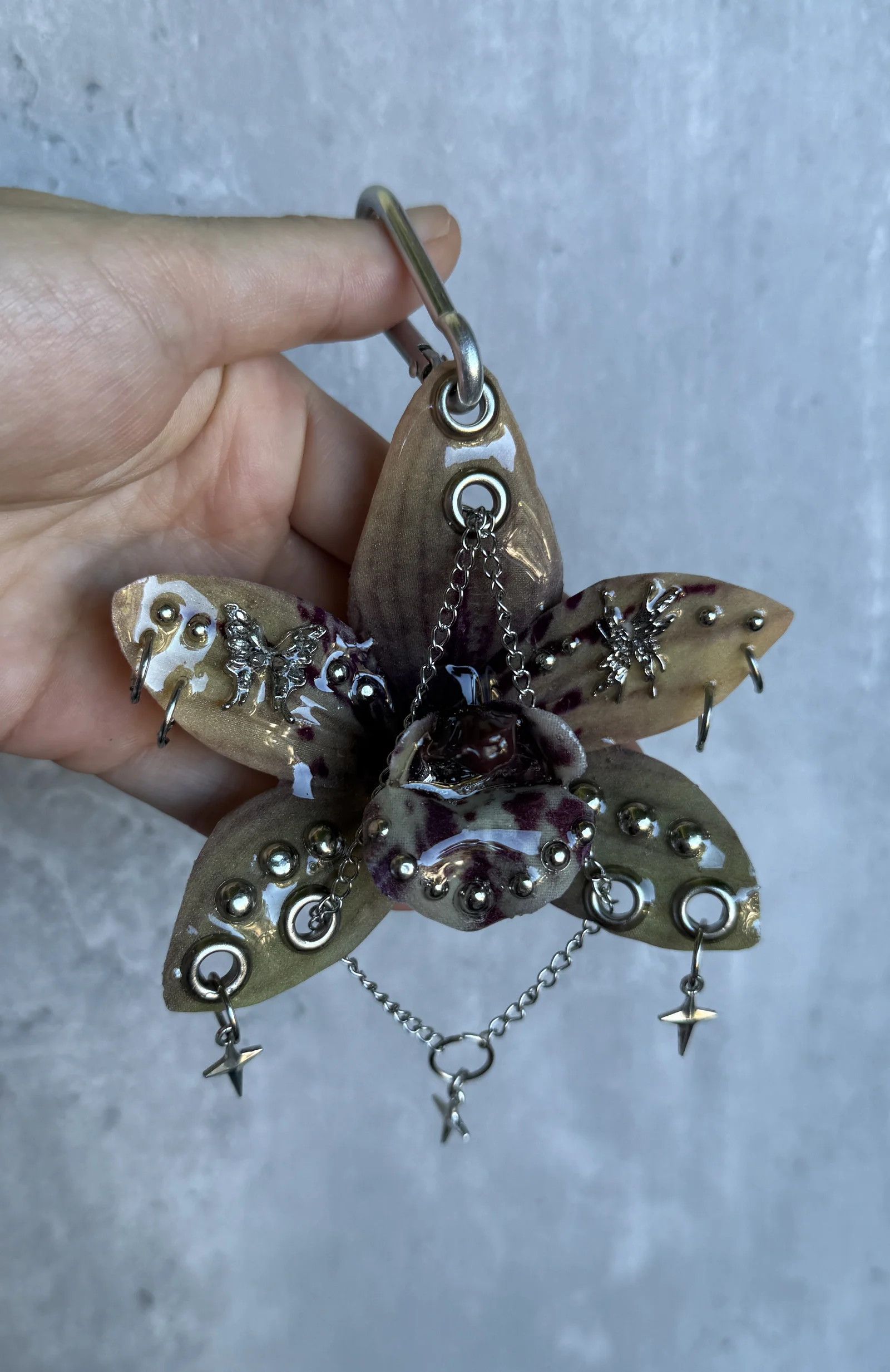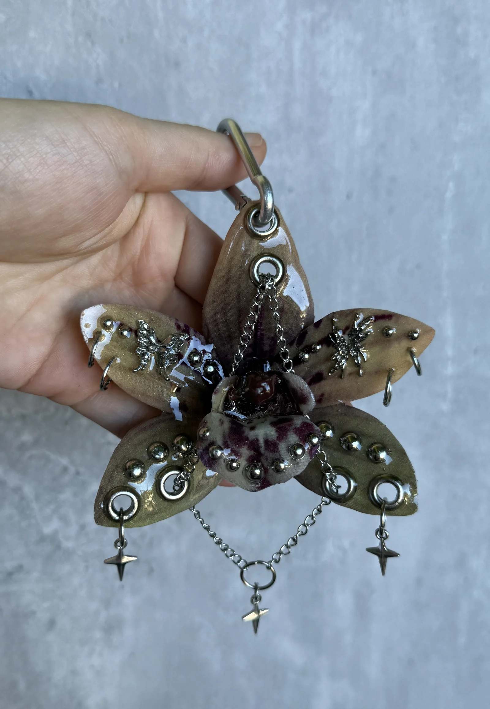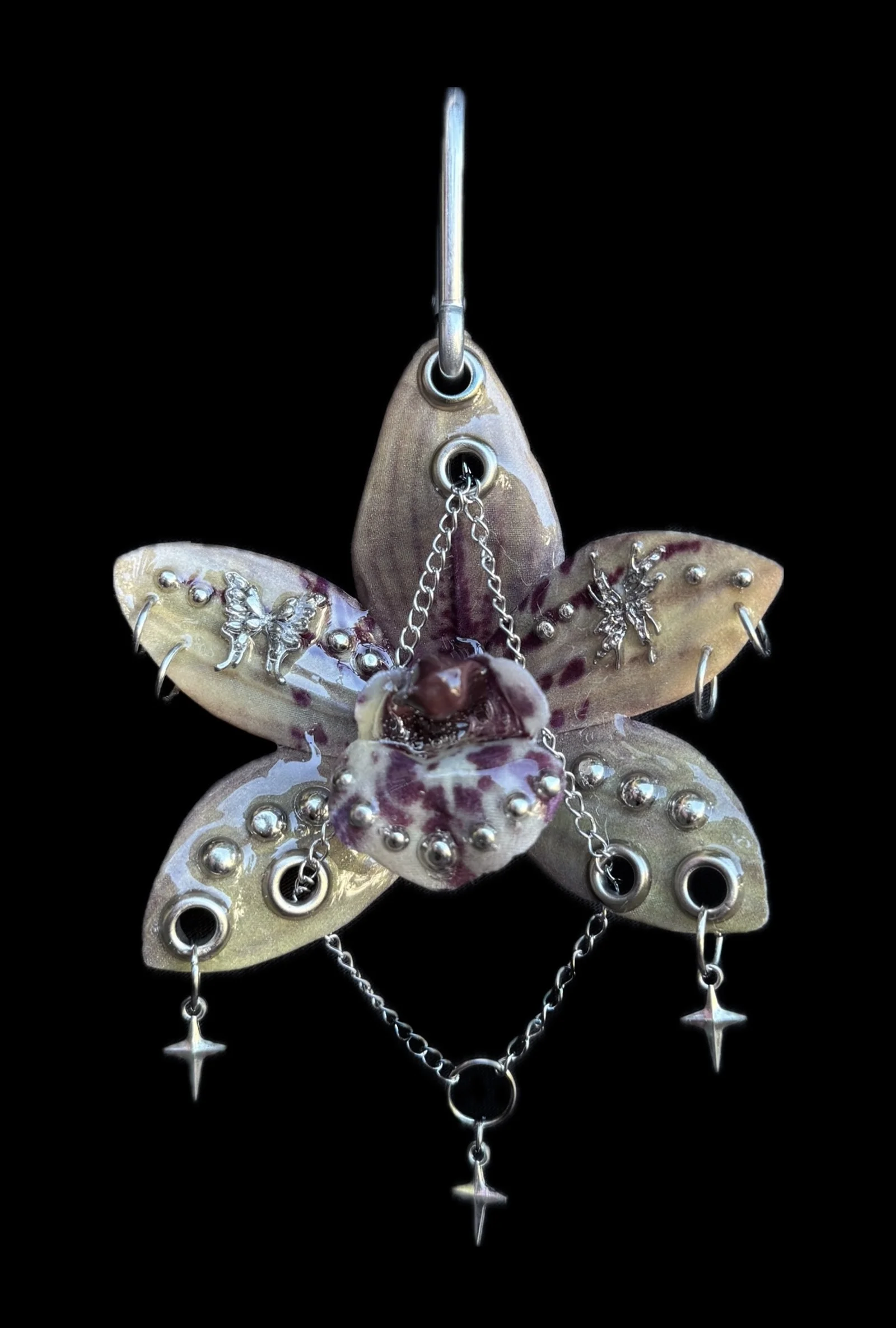 Beige orchid with dark burgundy spots and a glossy brown center. Metal grommets, chains, and tiny silver insects give it a sharp, eerie forest vibe.