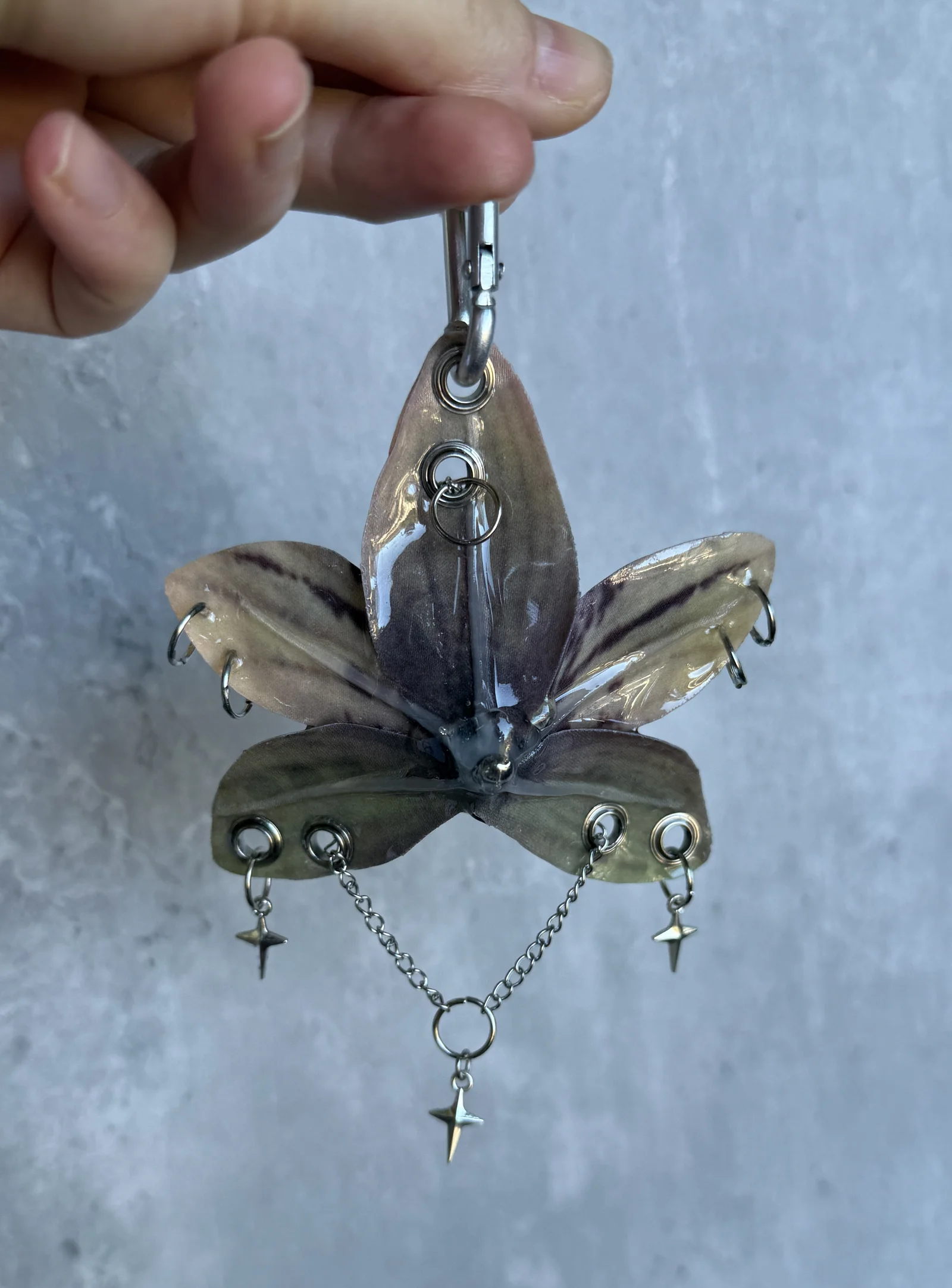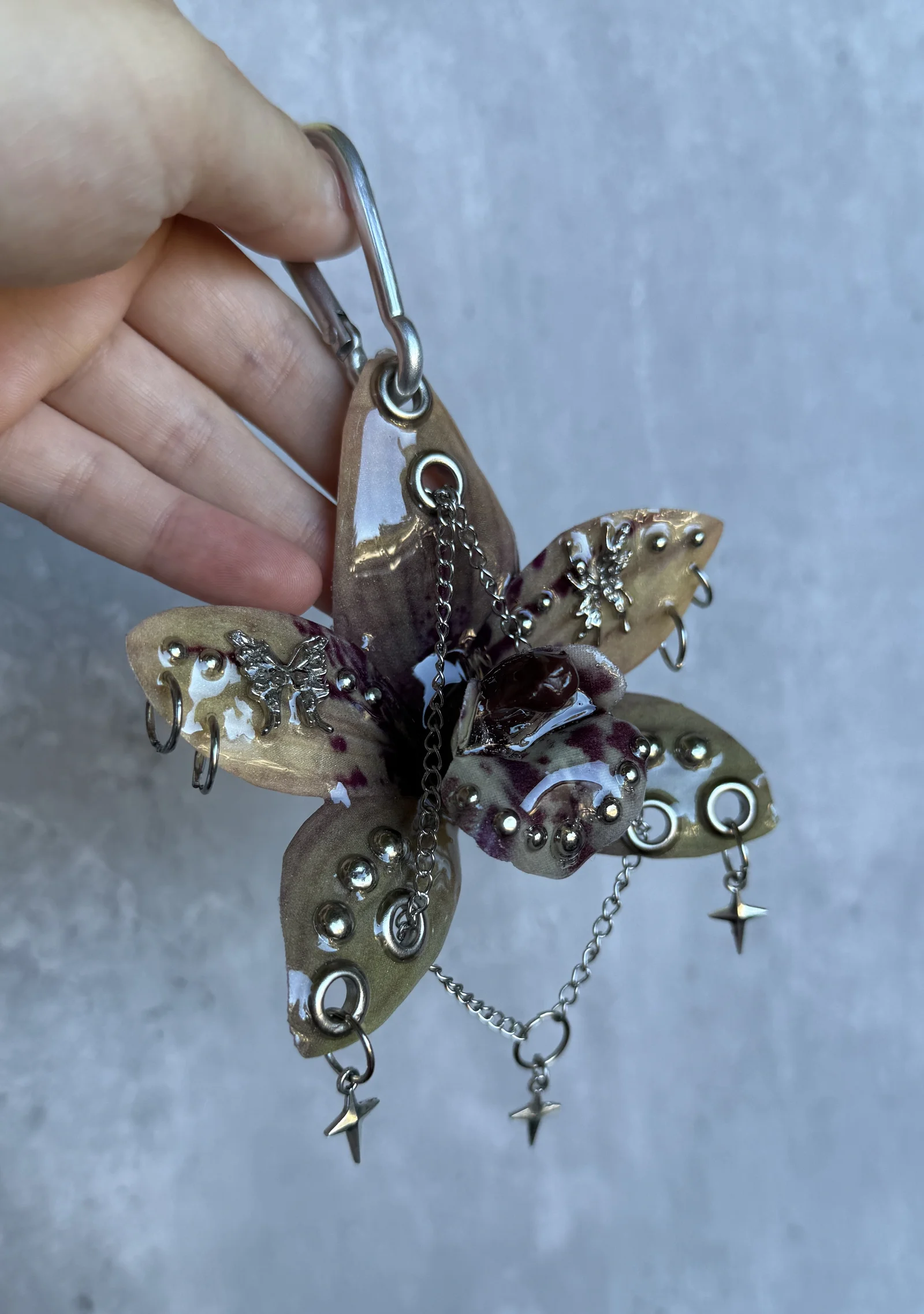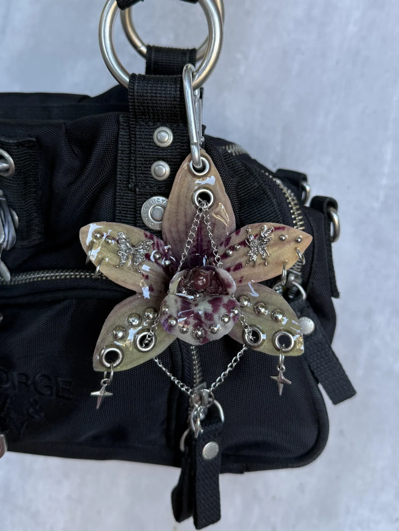 Beige orchid with dark burgundy spots and a glossy brown center. Metal grommets, chains, and tiny silver insects give it a sharp, eerie forest vibe.