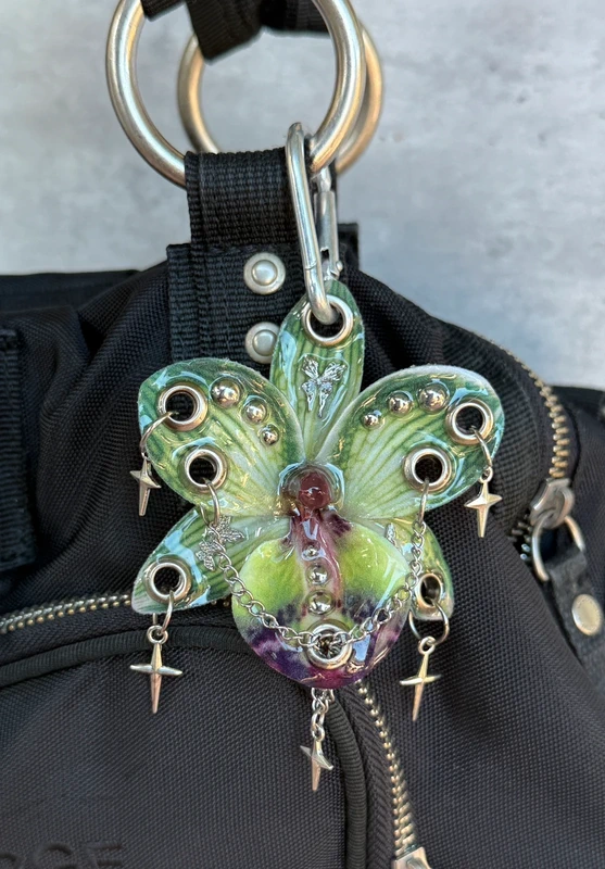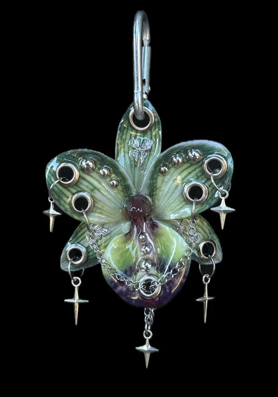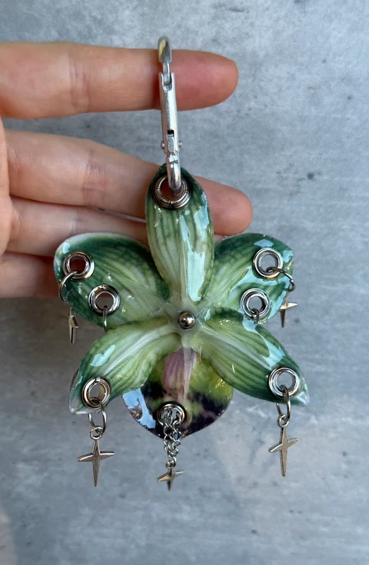 A green flower with a dark core. It looks alive, but it’s not soft. Chains and stars hold it together like armor. This piece is about control, silence, and inner strength. It can be used as a keychain, a bag charm, or a necklace with your own chain. size: about 7,5 х 7,5 cm artificial flower fully handmade coated with epoxy resin for durability one of a kind, no repeats price is fixed and non-negotiable not fragile, resistant for daily wear