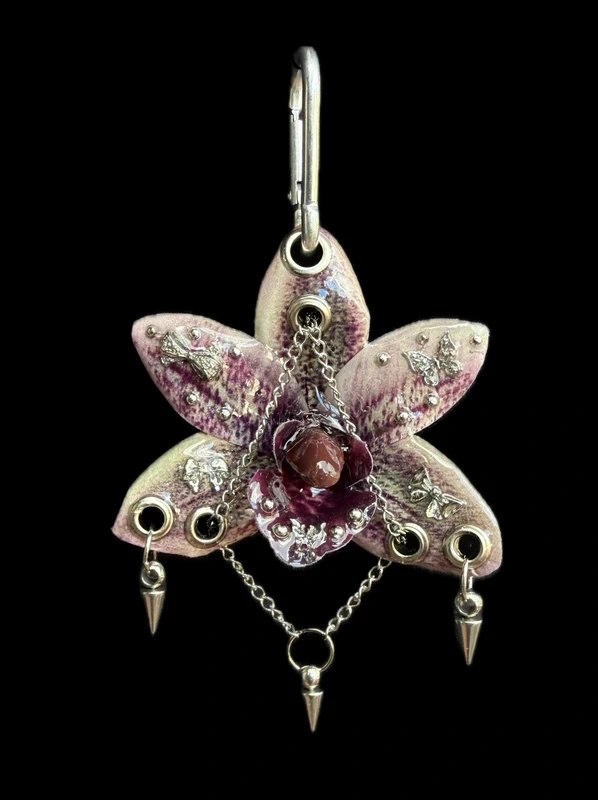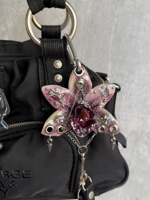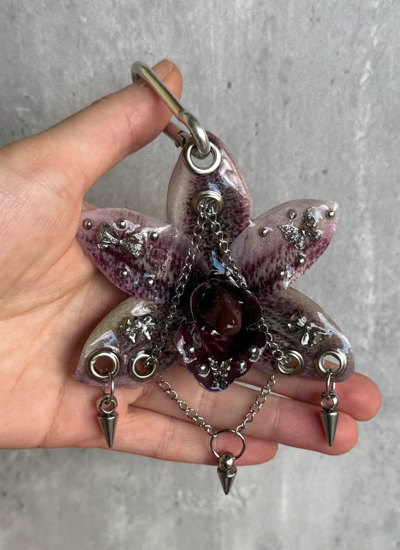 This orchid looks like it grew in a place where the light never fully reaches. The petals are eaten through with dark violet spots, like something creeping under the skin. It can be used as a keychain, a bag charm, or a necklace with your own chain. size: about 8×8 cm artificial flower fully handmade coated with epoxy resin for durability one of a kind, no repeats price is fixed and non-negotiable not fragile, resistant for daily wear