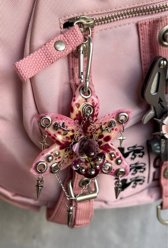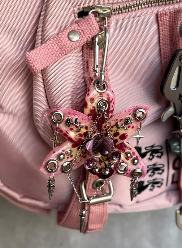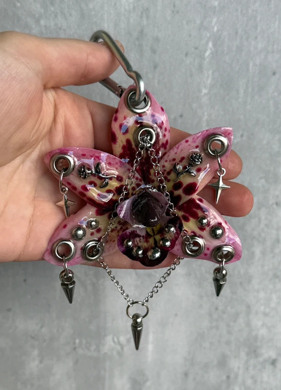A pink orchid keychain with dark red spots, metal studs, chains, and small spikes. Soft color mixed with a sharp, aggressive mood. Looks delicate at first, but has a dangerous edge. It can be used as a keychain, a bag charm, or a necklace with your own chain. size: about 8×8 cm artificial flower fully handmade coated with epoxy resin for durability one of a kind, no repeats price is fixed and non-negotiable not fragile, resistant for daily wear 🌸 more colors available on my profile.
