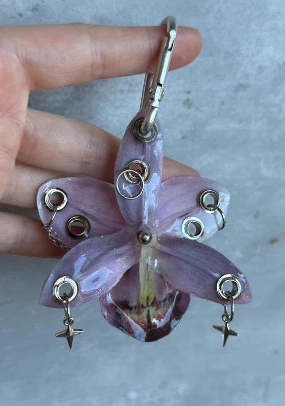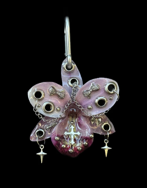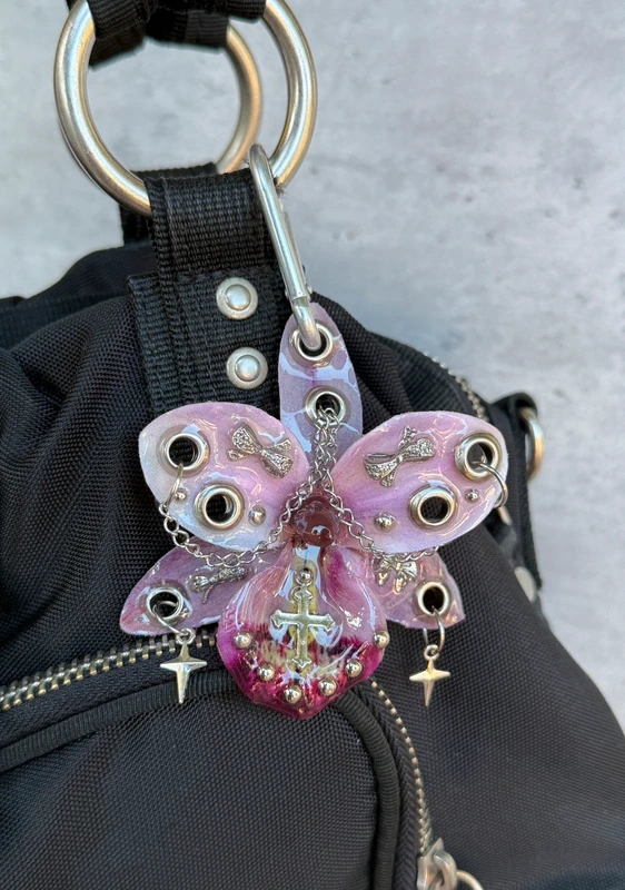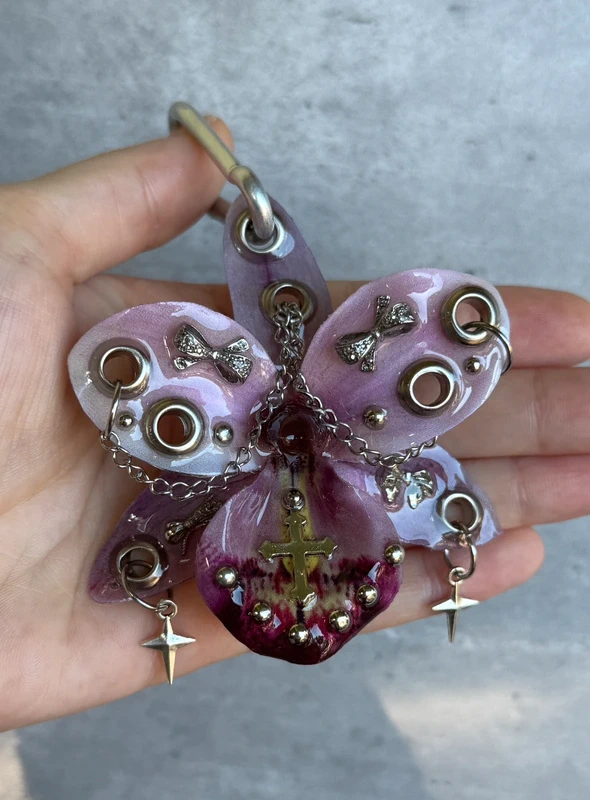 A pink-violet orchid that looks soft at first, but holds something darker inside. Chains pull it together, metal crosses and stars hang like quiet weight. It’s about contrast: fragile color, sharp details, beauty with tension. It can be used as a keychain, a bag charm, or a necklace with your own chain. size: about 7,5 х7,5 cm artificial flower fully handmade coated with epoxy resin for durability one of a kind, no repeats price is fixed and non-negotiable not fragile, resistant for daily wear