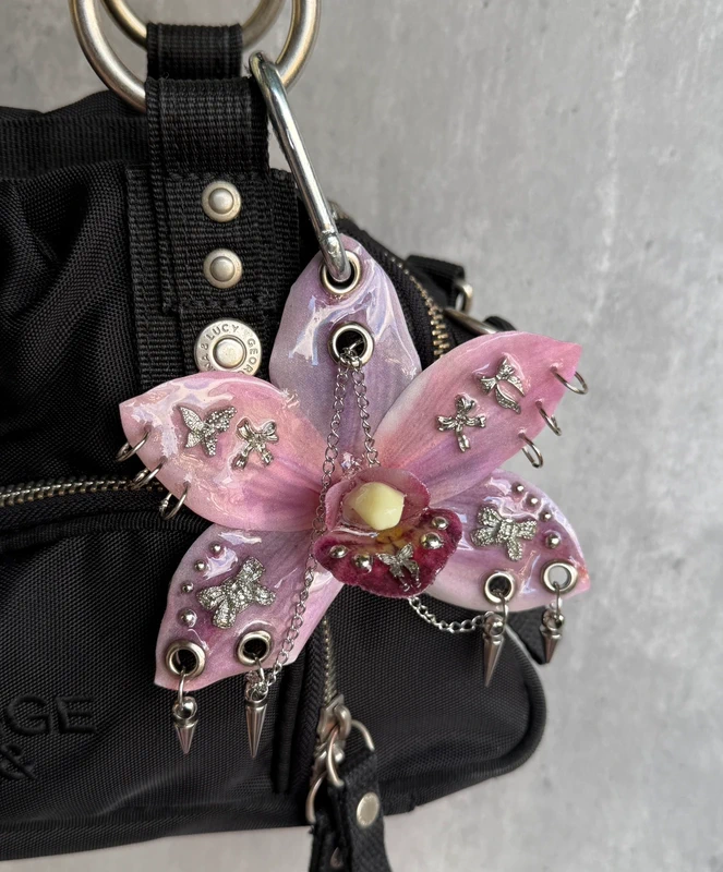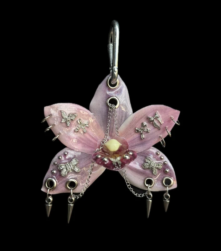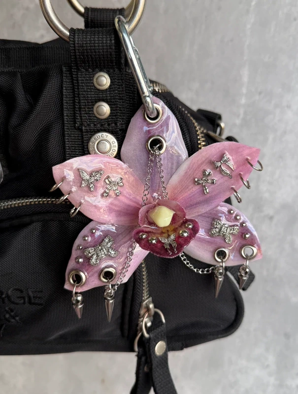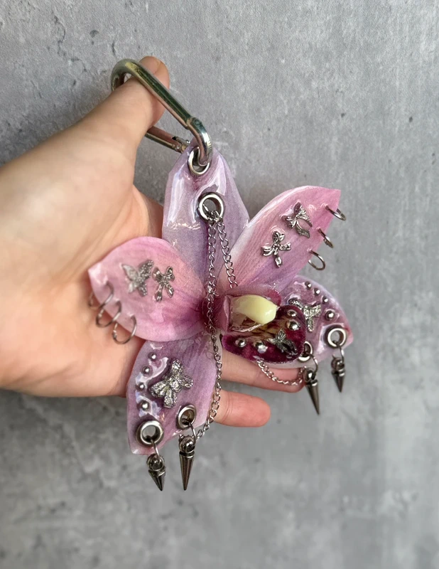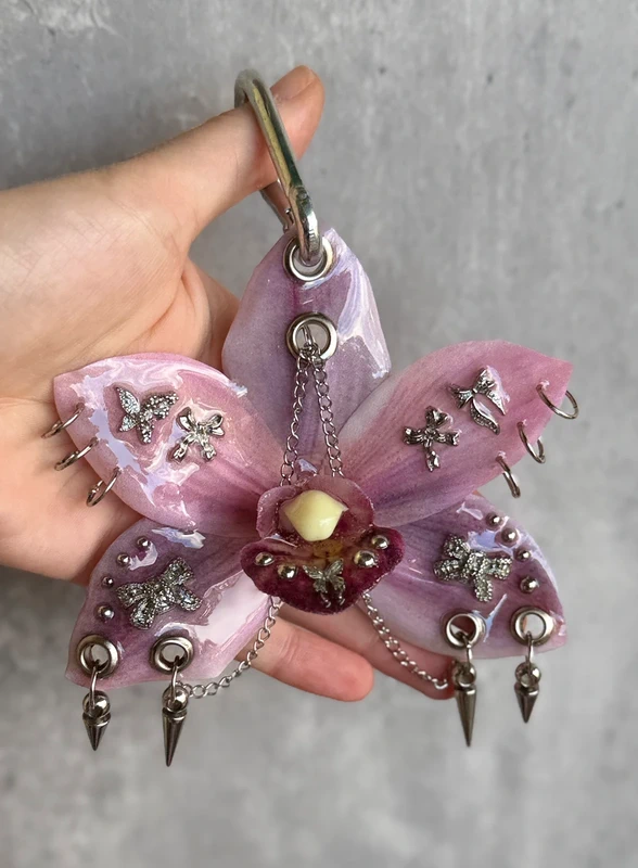 A soft pink orchid keychain with a gentle but edgy feel. Silver butterflies, small crosses, chains and spikes give it a delicate gothic touch. Light, romantic, and a little dark, easy to wear on a bag or keys. It can be used as a keychain, a bag charm, or a necklace with your own chain. size: about 10×10 cm artificial flower fully handmade coated with epoxy resin for durability one of a kind, no repeats price is fixed and non-negotiable not fragile, resistant for daily wear